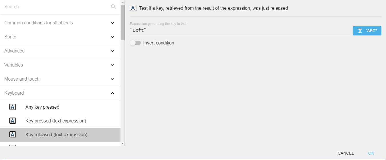 To test a key release using this condition, you need to enter the key name in the form of text expression. For example, if you want to check condition for left arrow key release, you need to enter "Left" in the field.
